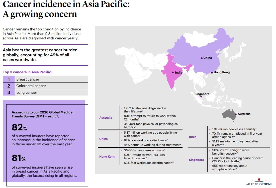 According to the 2026 Global Medical Trends Report by WTW, cancer remains the leading condition by incidence across Asia Pacific, with more than 9.8 million people diagnosed annually. The region now accounts for 49% of global cancer cases, placing immense strain on healthcare systems, insurers and workforces alike.