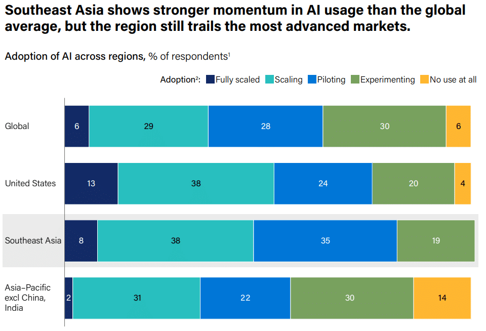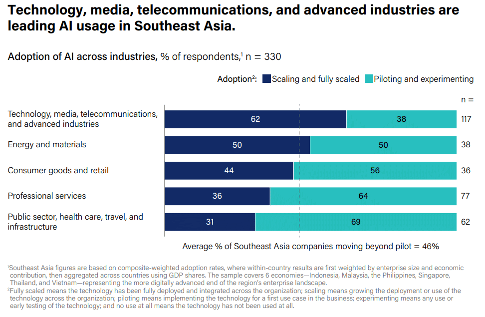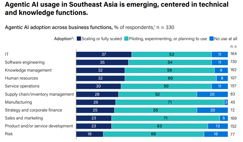 Across Southeast Asia, adoption of agentic AI is currently concentrated in technical and knowledge-driven functions such as IT, software engineering and knowledge management, where more than one-third of companies are already scaling or have fully scaled such systems.