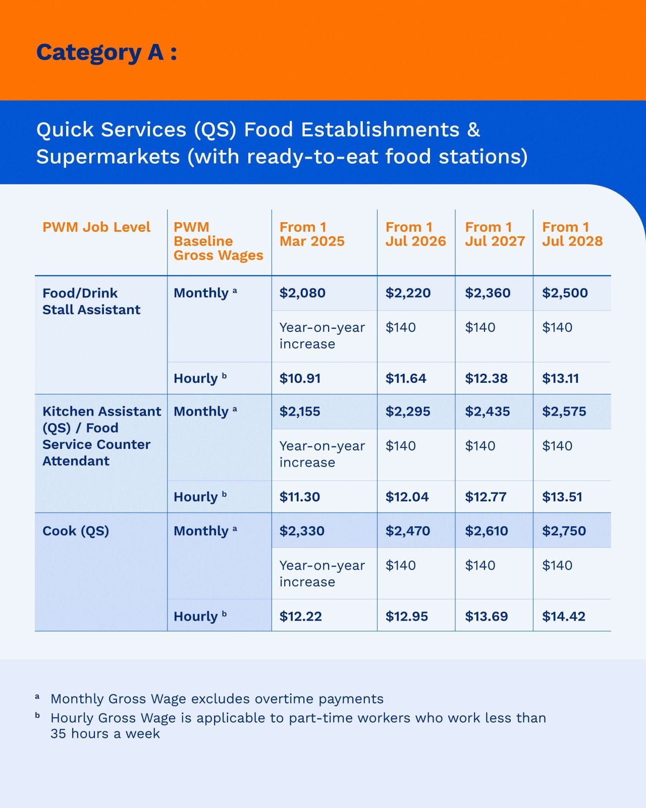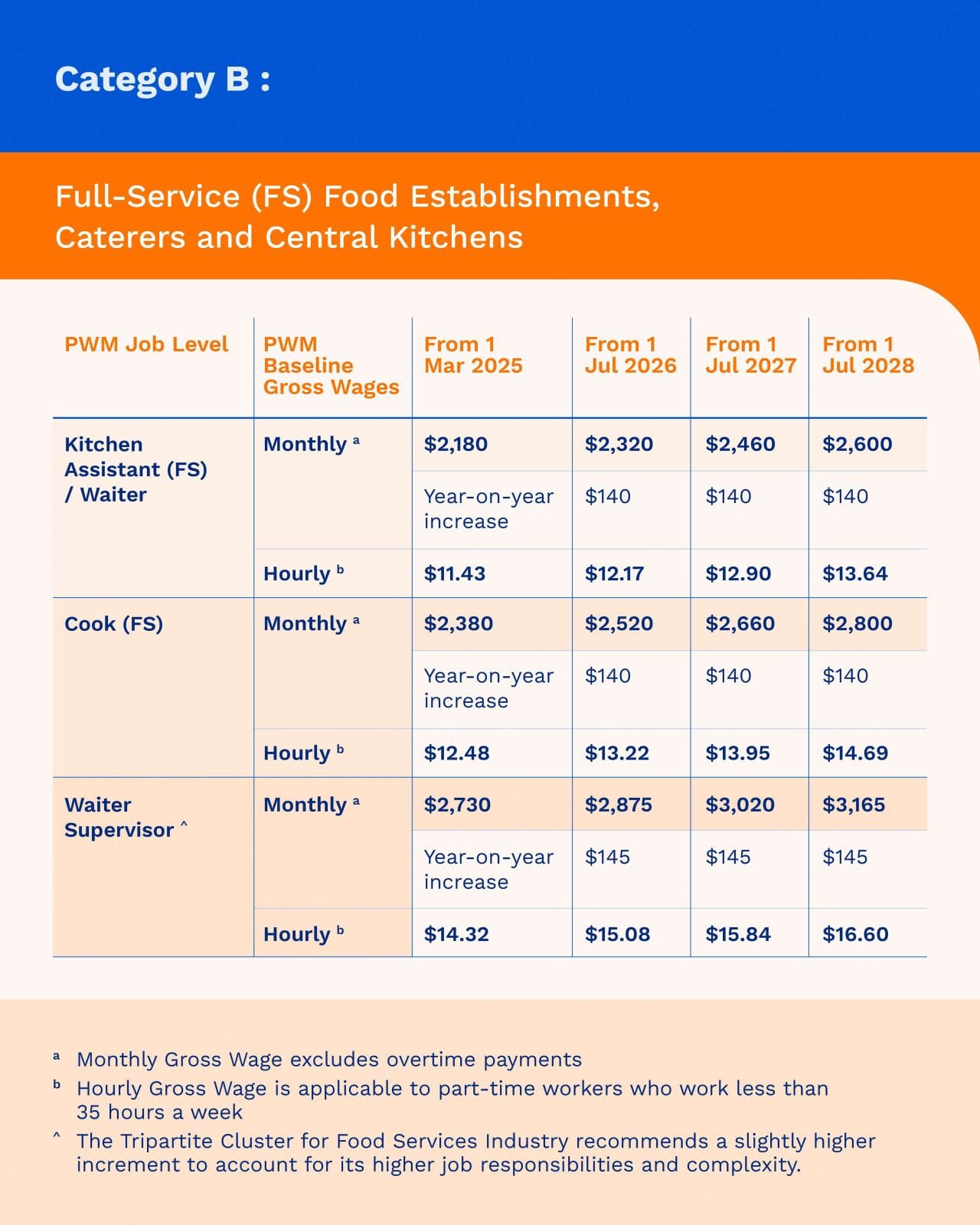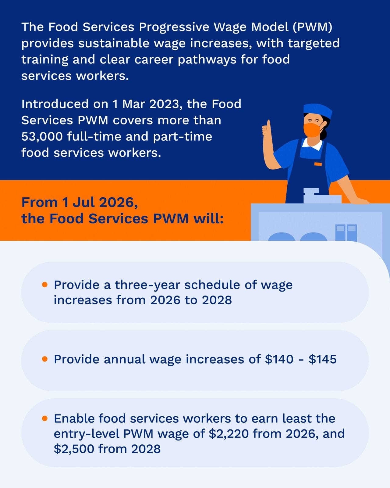 "To align with the implementation timeline for the majority of the PWM sectors, the food services wage schedule will take effect from 1 July each year, starting from 1 July 2026. Employers who employ workers in multiple PWM sectors can streamline their administrative processes, with lead time to adjust and comply with the new food services requirements."