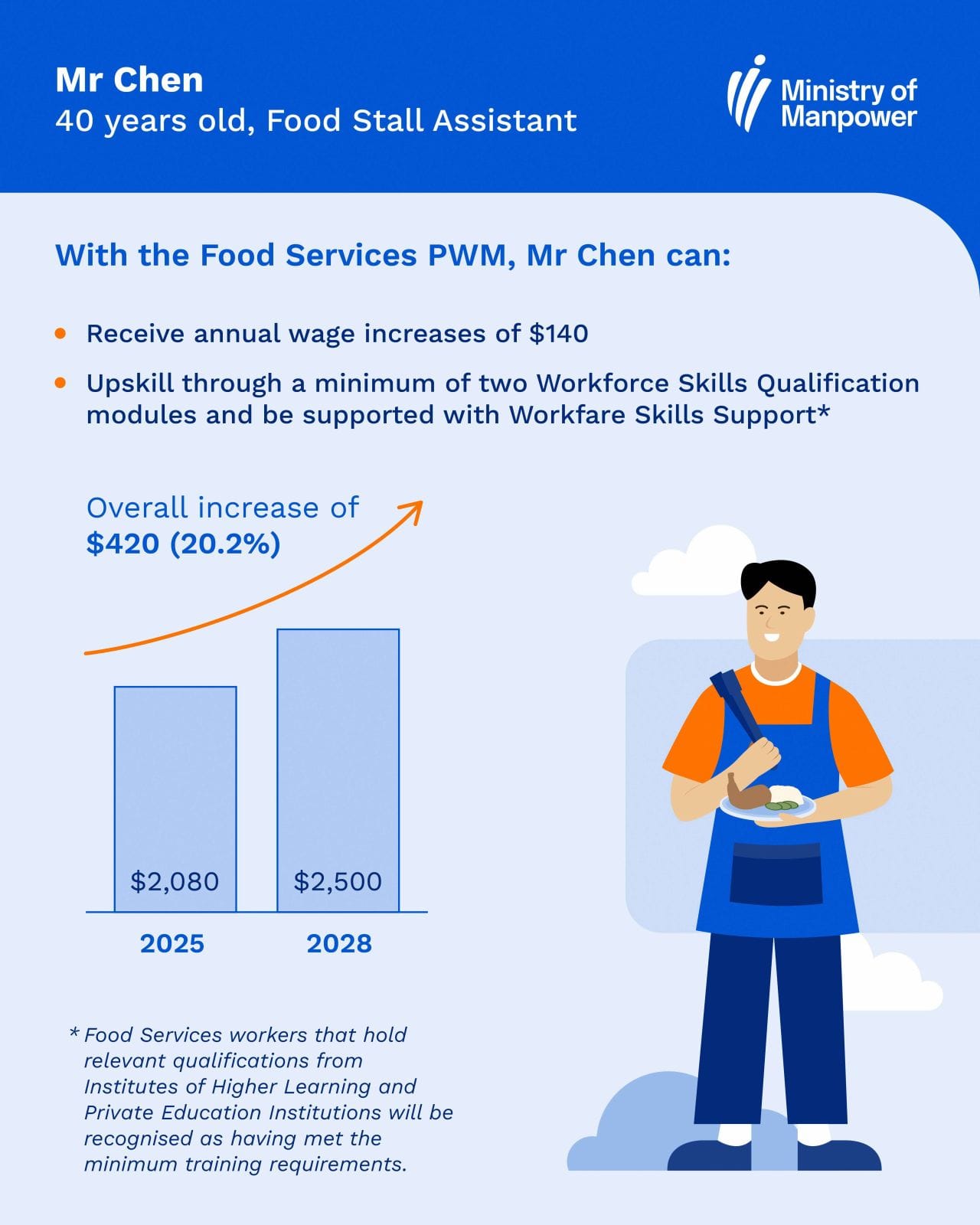 "From 1 July 2026, food services workers will earn at least the entry-level PWM wage requirement of $2,220, up from the existing PWM wage requirement of $2,080. From 2026 to 2028, this baseline monthly gross wage requirement will increase from $2,220 to $2,500. Food services workers can expect a year-on-year increase of up to $145 for the next three years," the Ministry said.