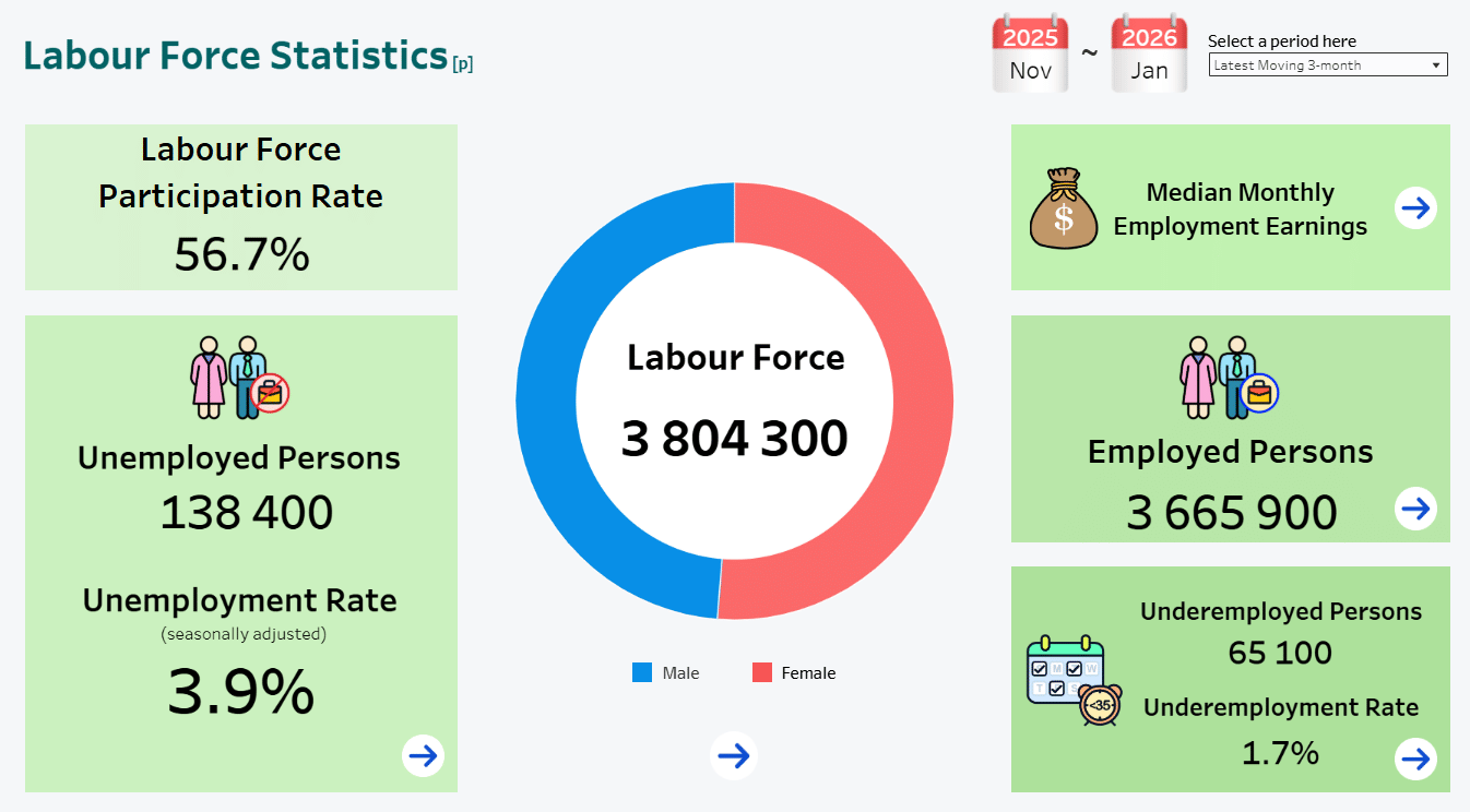 The seasonally adjusted unemployment rate in Hong Kong rose slightly to 3.9% in the November 2025–January 2026 period, up from 3.8% in the preceding three months, according to provisional labour force statistics released by the Census and Statistics Department.