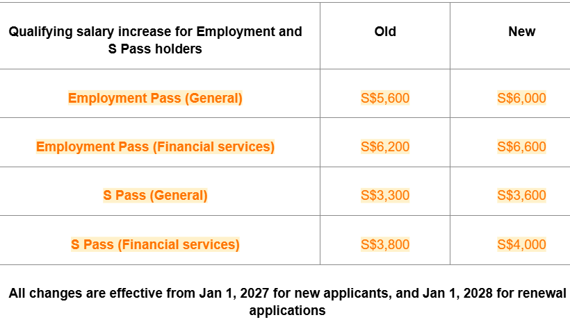 Similarly, the minimum qualifying salary for new S Pass applicants will be increased from January 2027 to S$3,600, up from S$3,300.