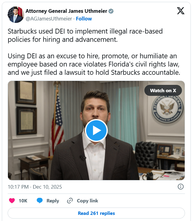 Florida’s Attorney General James Uthmeier has filed a lawsuit accusing the Seattle-based coffee chain of turning DEI from a corporate value into what he calls a “mandatory hiring and promotion system based on race.”