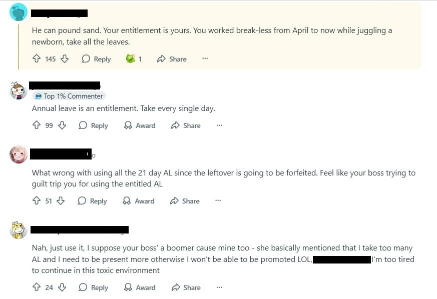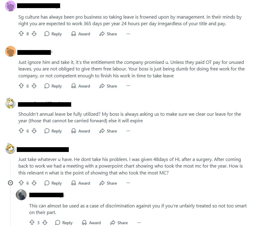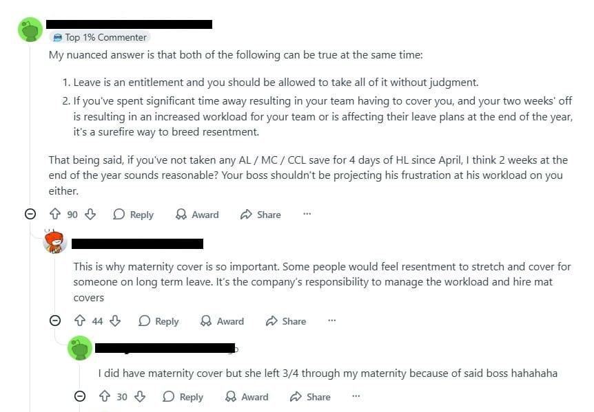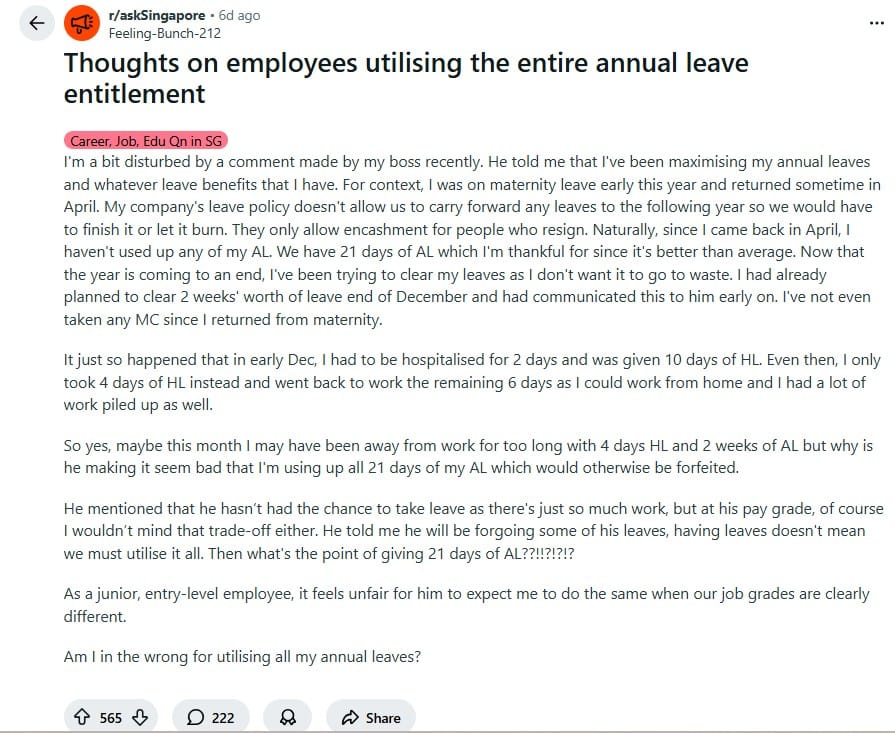 The discussion struck a broader chord, highlighting a recurring workplace tension in Singapore and beyond: when leave exists on paper but is subtly discouraged in practice.