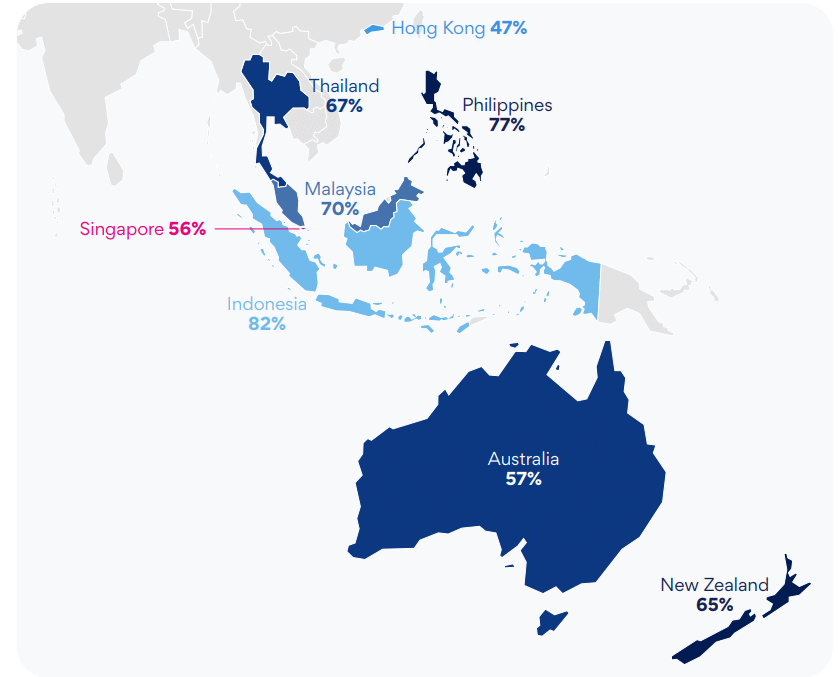 Indonesia tops the regional rankings, with 82% of workers reporting they are happy at work, followed by the Philippines at 77% and Malaysia at 70%. Australia stands at 57%, narrowly ahead of Singapore, while Hong Kong ranks last at 47%.