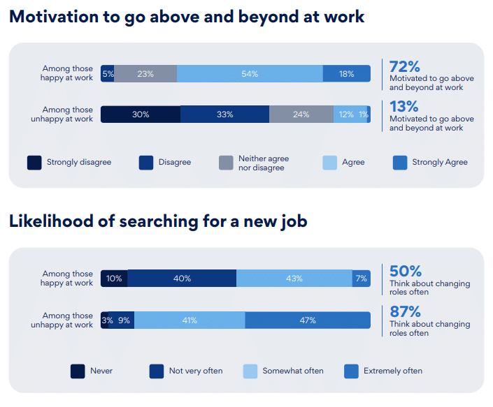 The consequences for employers are significant. Happy employees are five times more likely to go above and beyond in their roles and are 37% less likely to be actively seeking another job. Conversely, unhappy workers are 1.5 times more likely to experience burnout and nearly twice as likely to dread going to work.