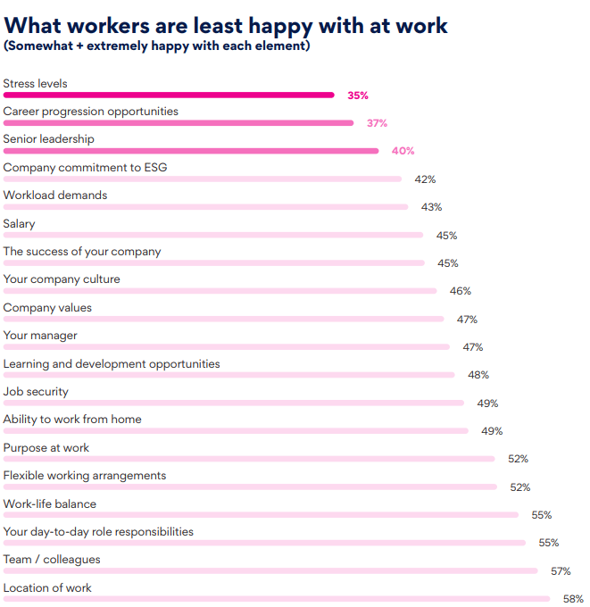 Despite widespread belief in workplace happiness, 45% of workers report feeling burnt out or exhausted. Stress levels are a particular pain point, with only 35% saying they are happy with their stress at work—the lowest-rated workplace attribute measured.