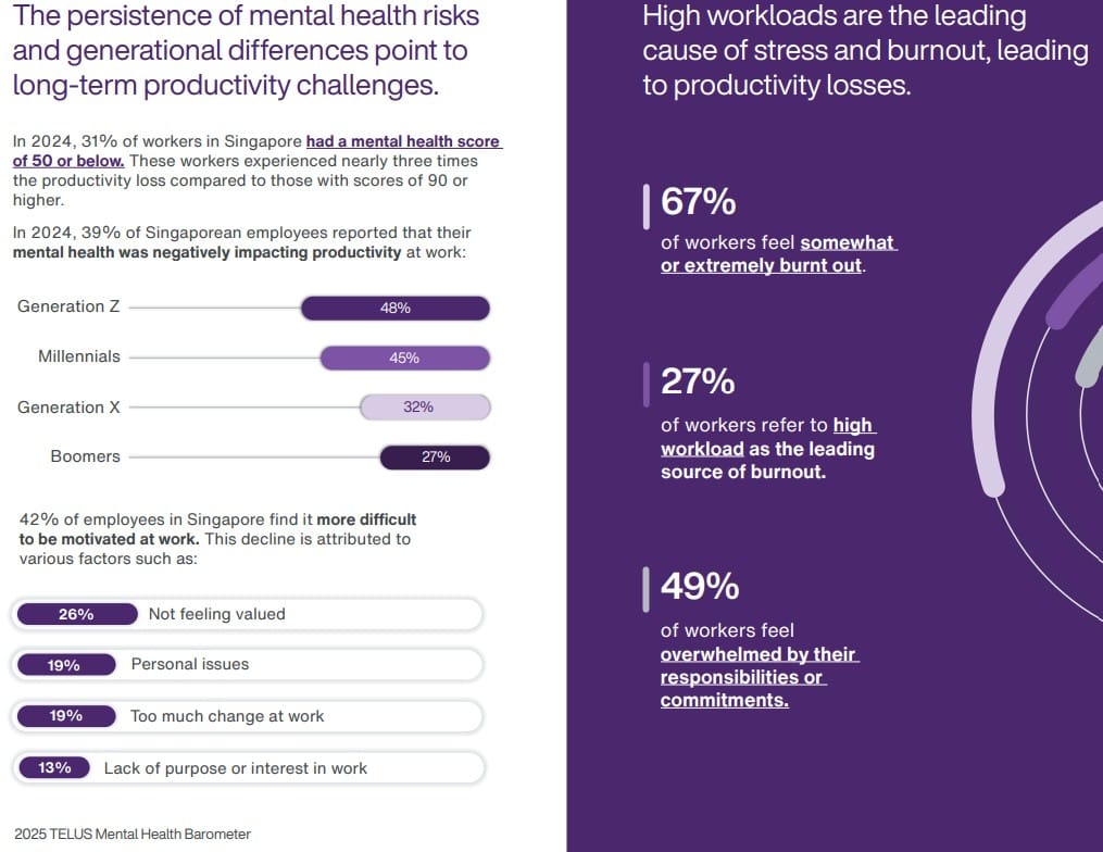 According to the latest Telus Mental Health Index (MHI), Singapore’s workers recorded a mental health score of 63.5, the highest since the index launched in April 2022. The score places most employees in the “strained” category (50–79), suggesting overall progress in resilience and coping mechanisms amid continued economic uncertainty.