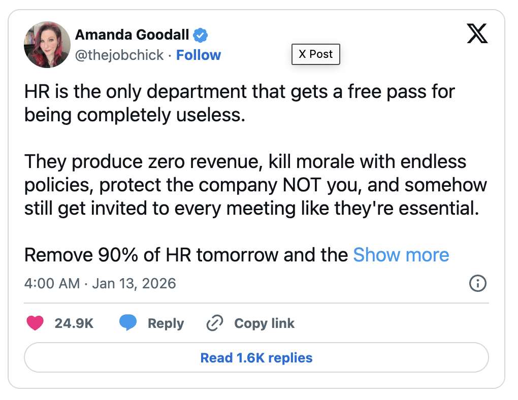 Goodall, known online as @thejobchick, accused HR departments of producing no revenue, suffocating morale with policy and serving the company, not employees. The post went viral within hours, spilling across X, LinkedIn and private executive forums, as workers and managers shared their own experiences.