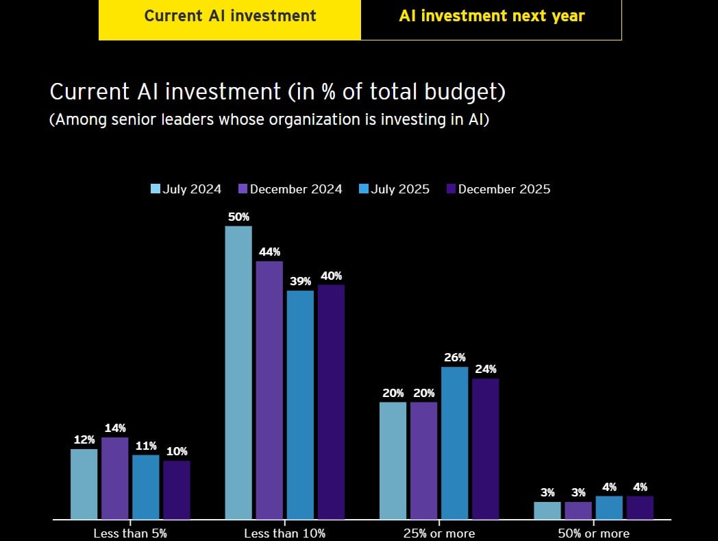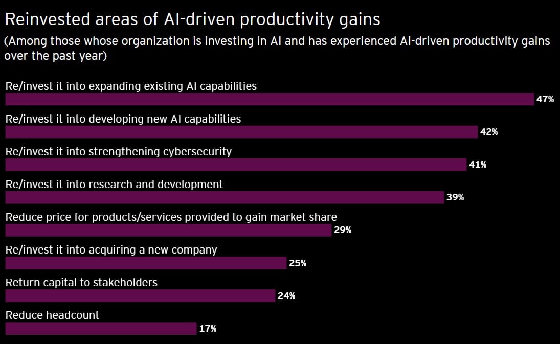 A further 34% are using the productivity boost to hire external talent with specialised AI expertise, while 32% are redirecting gains towards executive compensation and bonuses.