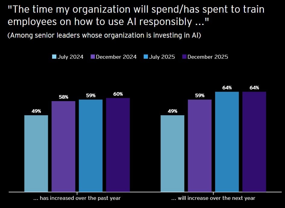 60% senior leaders in the report said the time spent on responsible AI training for employees has increased over the past year, with the same proportion expecting that commitment to grow further in the year ahead.